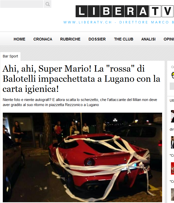 ミランのイタリア代表FW、マリオ・バロテッリがスイスで“災難”に遭ったようだ。スイスメディアの『LiberaTV』が伝えている。