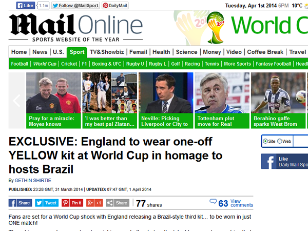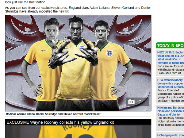 http://www.dailymail.co.uk/sport/worldcup2014/article-2593515/Revealed-England-wear-one-YELLOW-kit-World-Cup-homage-hosts-Brazil.html
