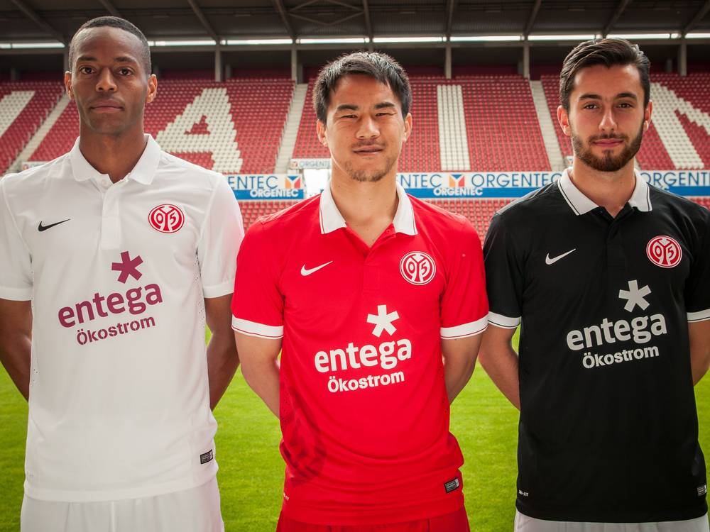 左の白がアウェイ、右の黒がサード。いずれもホームと同様シンプルなポロネックを採用している。胸スポンサーは地元マインツの電力会社「Entega(エンテーガ)」。