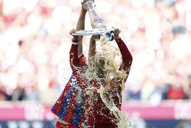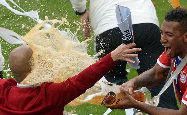 試合終了後のピッチでは恒例のビールシャワー。今年はジョゼップ・グアルディオラ監督がターゲット!