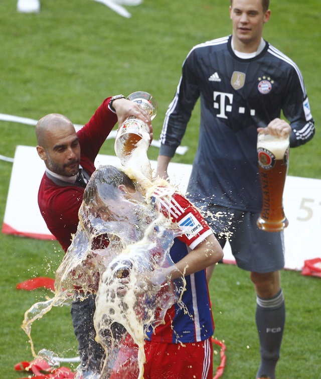 マイスターシャーレを掲げるペップにファン・ブイテンがドバーっと!
