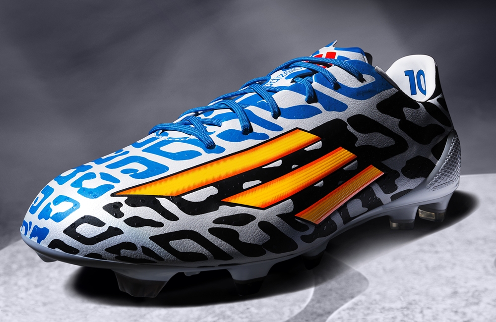 その中でも、アルゼンチン代表のリオネル・メッシはアクセントとして青が取り入れられた独自のモデル、「アディゼロ F50 LM」を着用。ヒール内側部分にはメッシの背番号に因んだ “10"が入れられている。(他のモデルは2014年の“14")