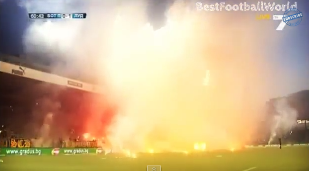 ルドゴレツに1点のビハインドを負ったボテフ・プロフディフのサポーターは情熱のあまり、スタジアムをこんな具合にしてしまったそう。試合は20分の中断。試合前には両チームのサポーターが衝突し、石を投げられた選手もいたんだとか。