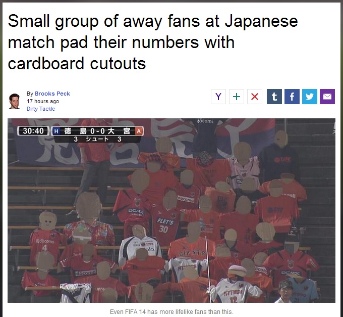 これはちゃんとアウェイということを伝えているが、「(ゲームの)FIFA14でさえこれよりはもっと本物っぽいファン(の姿をしている)」との小見出し。
