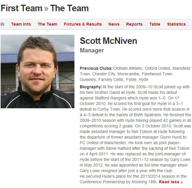 スコット・マクニヴン監督はオールダム、フリートウッド・タウンなどに在籍経験のあるストライカーで2012年より指揮、双子の兄弟のデイヴィッドは未だ現役でスポーツサイエンチストも兼任している。マクニヴン兄弟の奮闘あってか2012/13シーズンにはチームを残留(18位)に導いたのだが、今シーズンは悪い流れを止めることができなかった。