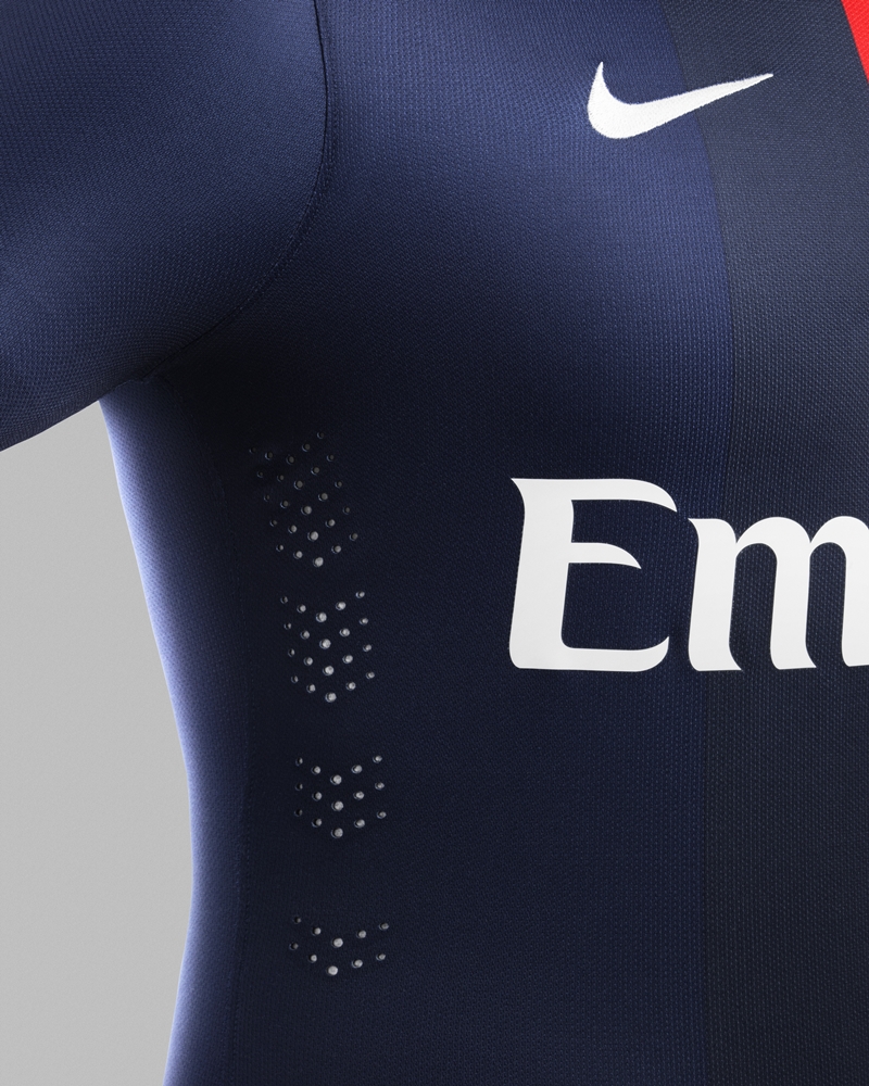 PSGの2014-15モデルは、10年ほど前から定着している紺に近い青をベースに、赤と白のツートンカラーのラインを中央に配置。過去に意外とありそうでなかったデザインで、写真だと分かりづらいが身頃の中央部分はやや濃いめの青を採用している。