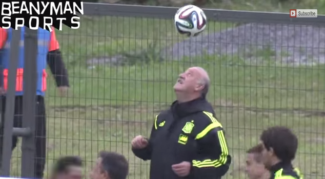 ボールをほぼ回転させることなく、20回近くヘディングのリフティングを成功させたビセンテ・デル・ボスケ監督。