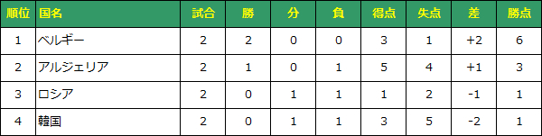 韓国対ベルギーで韓国が引き分けるか敗れると突破。韓国が勝利した場合は韓国と得失点差を争う