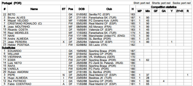 DFペペは第一戦のレッドカードで出場停止、GKルイ・パトリシオ、FWウーゴ・アウメイダは怪我、DFファビオ・コエントラォンは怪我の治療により母国へ帰還したため欠席扱いになっている。12名のベンチ入りが許されるワールドカップ本大会だが、僅か8人のベンチ入りとなった。