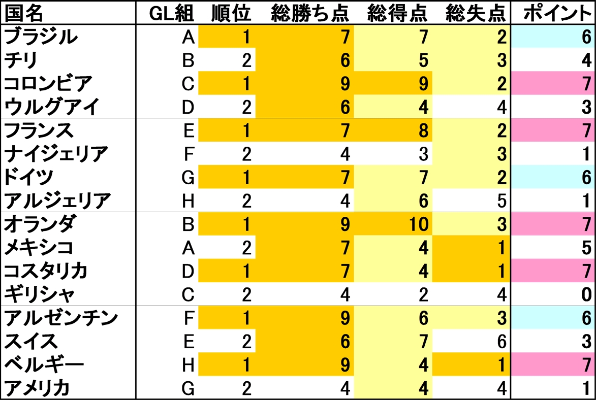 トーナメント表では右上に来るブロックでは、前編でオランダがメキシコに苦戦するのではと予測。この表でも順位のアドバンテージ以外はほぼ互角です。どちらにしてもベスト8でコスタリカと当たりそうですが、ここも接戦、ただオランダが来た場合では守備力でコスタリカが競り勝つ可能性が高くなっています。