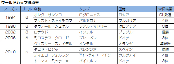 2002年のロナウドや2010年のビジャなど、チームを頂点へと導いたエースストライカーや、「そう言えば」といった名前も見つけることができるワールドカップ得点王。