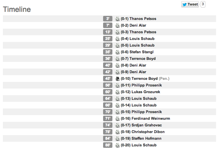 ズラリと並んだスコアラーだが、前半10点後半10点と綺麗に分かれており、最多スコアラーはルイス・シャウブの5得点。なお、2人のハットトリック達成者が出ている。