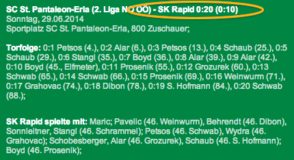 こちらは、オーストリアのザンクト・パンターレオン=エルラとラピド・ウィーンの親善試合の結果である。現地時間6月29日に行われたこの試合では、なんとラピド・ウィーンが20-0の爆勝を収めたというのだ。