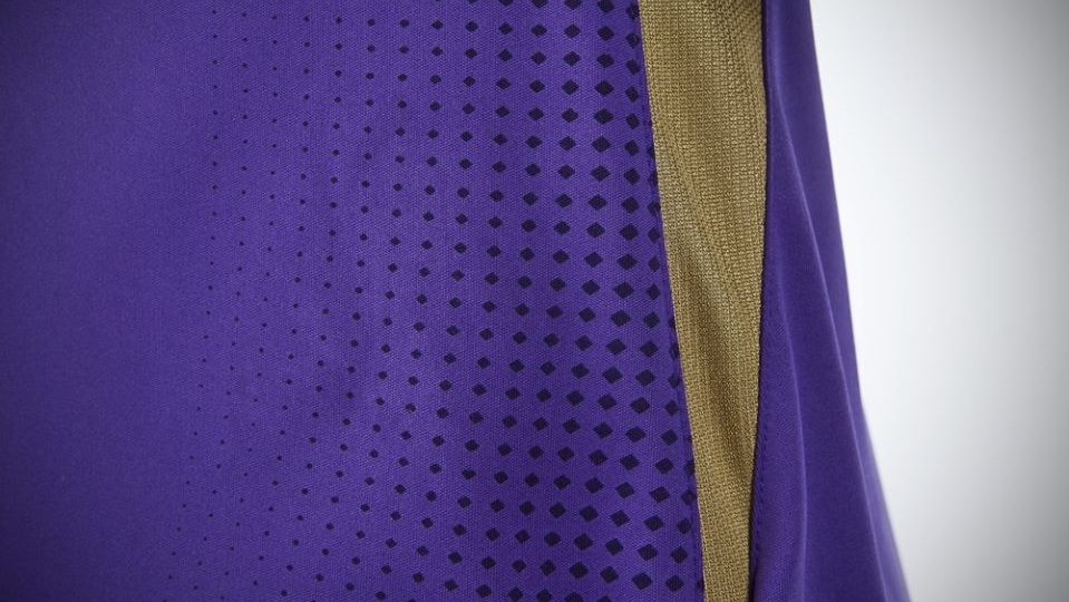 アウェイはホームの色違いを採用し、白をベースに紫。こちらの方がドット柄をはっきりと確認できる。