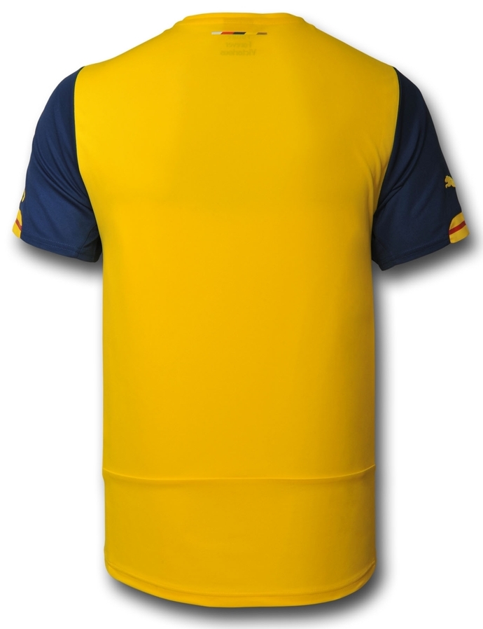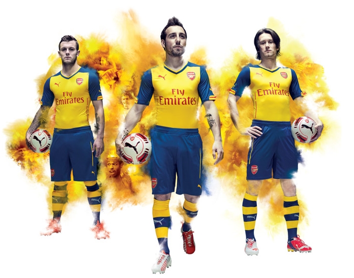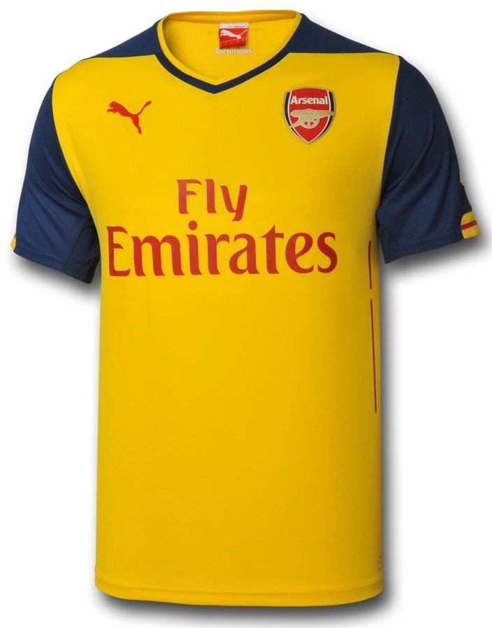 “Victorious”(勝者)のアウェイは、アーセナルのアウェイカラーとして定番の一つであり、優勝の瞬間にもたびたび立ち会ってきた黄色を採用。袖を紺にすることでホームとの共通性を持たせている印象だ。