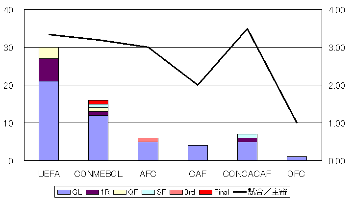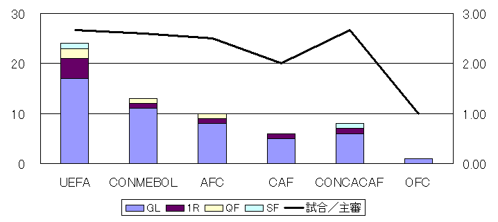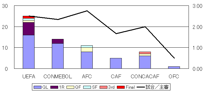 審判の選出方法を改革した2006年以降、3大会で各大陸連盟の主審がどの段階の試合をどれだけ担当したのか、主審1人当たりの担当試合数を示す折れ線グラフと一緒に並べてみました。