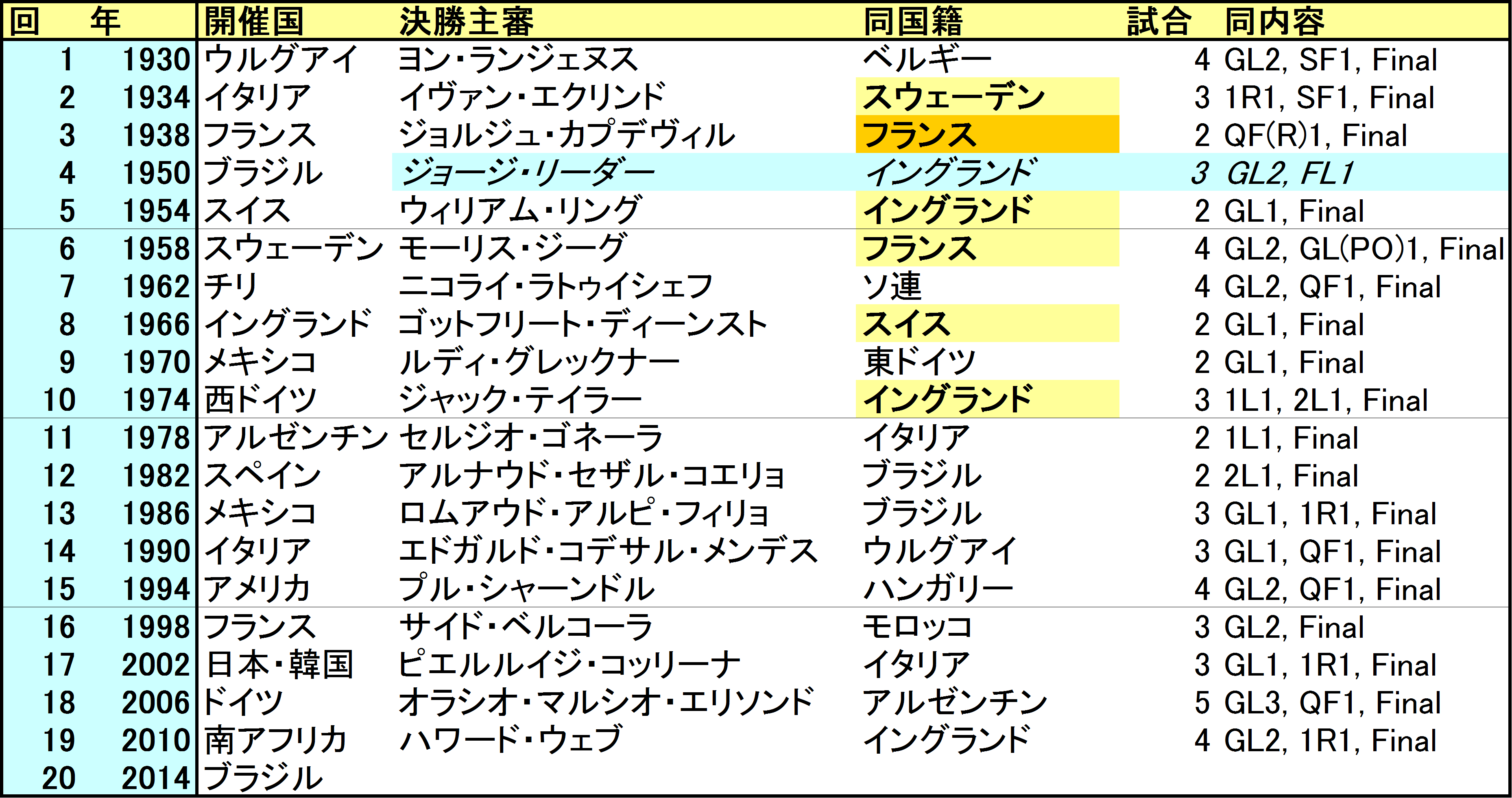 <表2>W杯全大会での決勝戦主審一覧