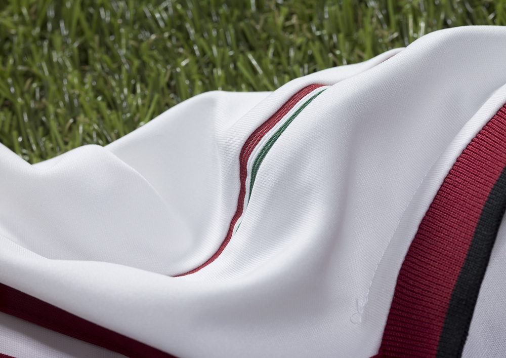 ミランの定番である白のアウェイは今季、ベージュのボーダー柄を採用(上の写真だと全体が黄みがかっているように見えるが白)。