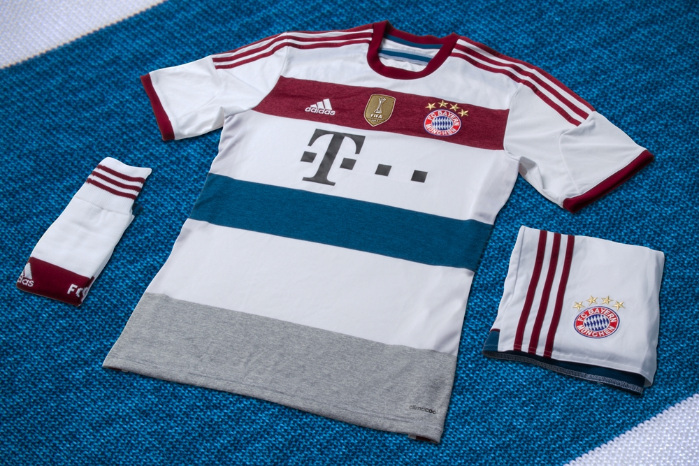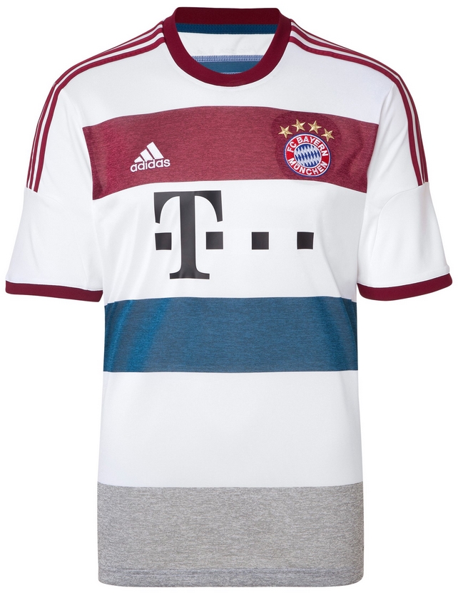 昨季、伝統的な衣装をイメージしたユニークなデザインを採用したバイエルンのアウェイ。2014-15モデルは白をベースに、ストリートファッションを意識したカジュアルなクラブカラーのボーダー柄となった。