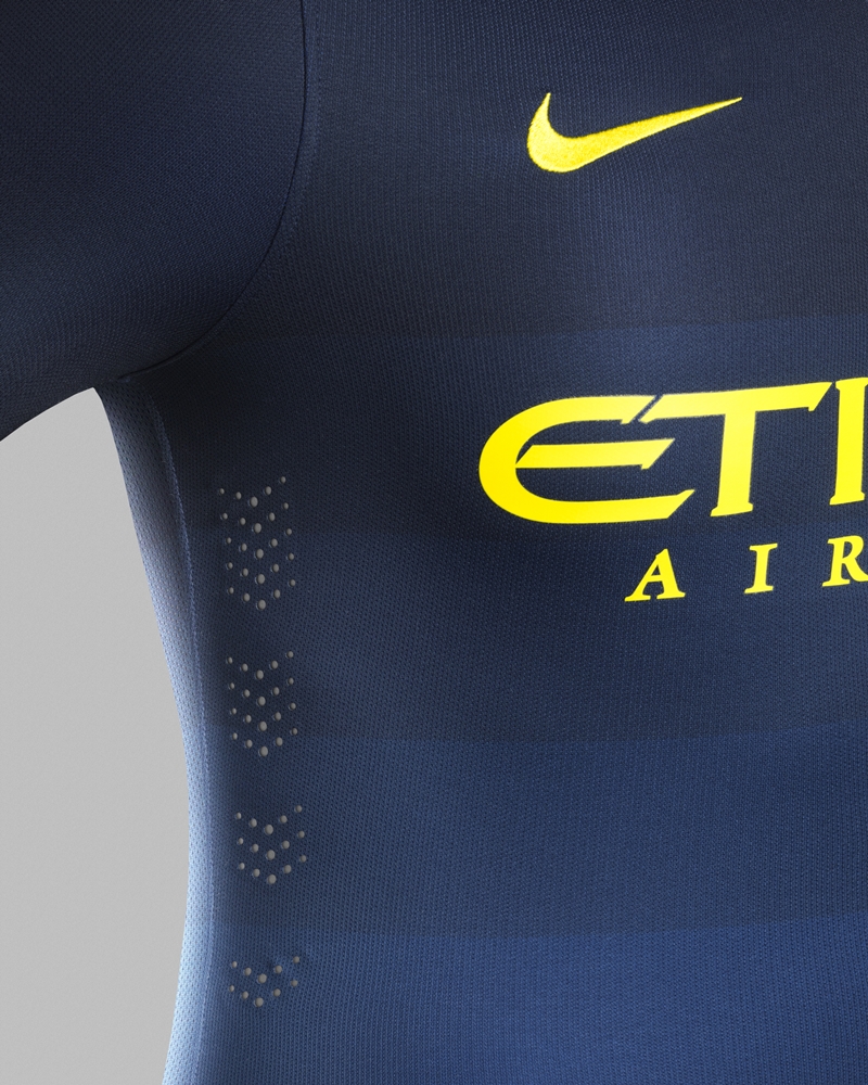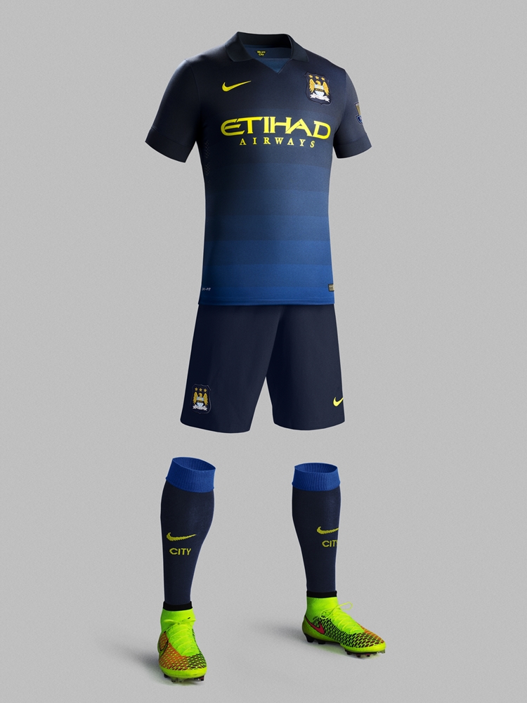 そのシティの2014-15アウェイが25日に発表され、紺をベースにしたユニフォームが登場。濃淡2色によるグラデーションを採用しており、首元の逆三角形型のガゼット部分には明るめの青が配されている。