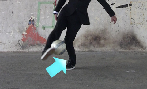 2. 軸足で前方にジャンプしてボールを前へ蹴り上げる