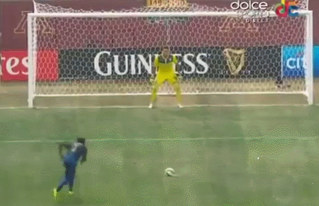 両チーム2点ずつを取り合った後のPKではこんなシーンもあった。シティDFマイカー・リチャーズのキックがこちら。