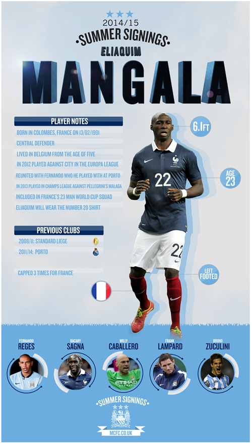 シティは今夏、ウィリー・カバジェロ、フェルナンド、フランク・ランパード、バカリ・サニャ、そしてブルーノ・スクリーニを獲得しており、マンガラは6人目の獲得選手となる。なお、移籍金は現時点で公表されていないが、3200万ポンド(およそ54億円)になるとみられている。