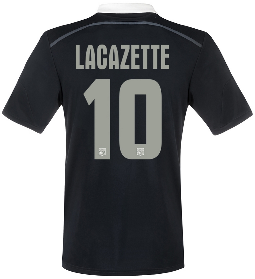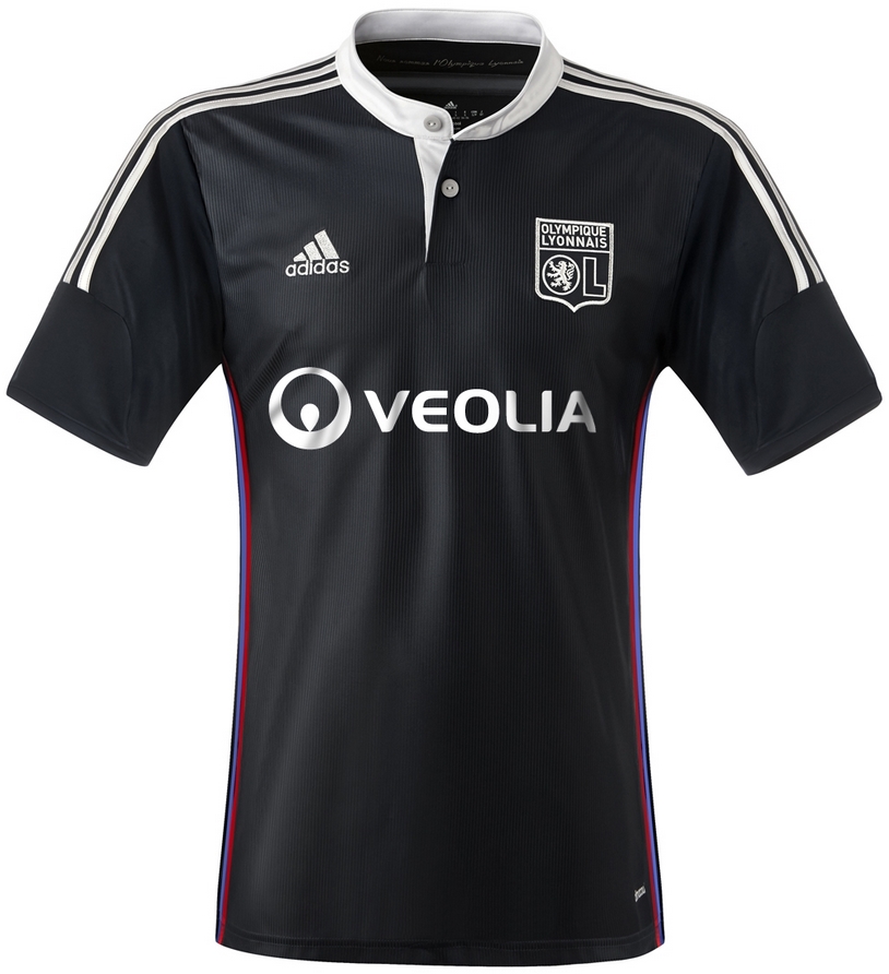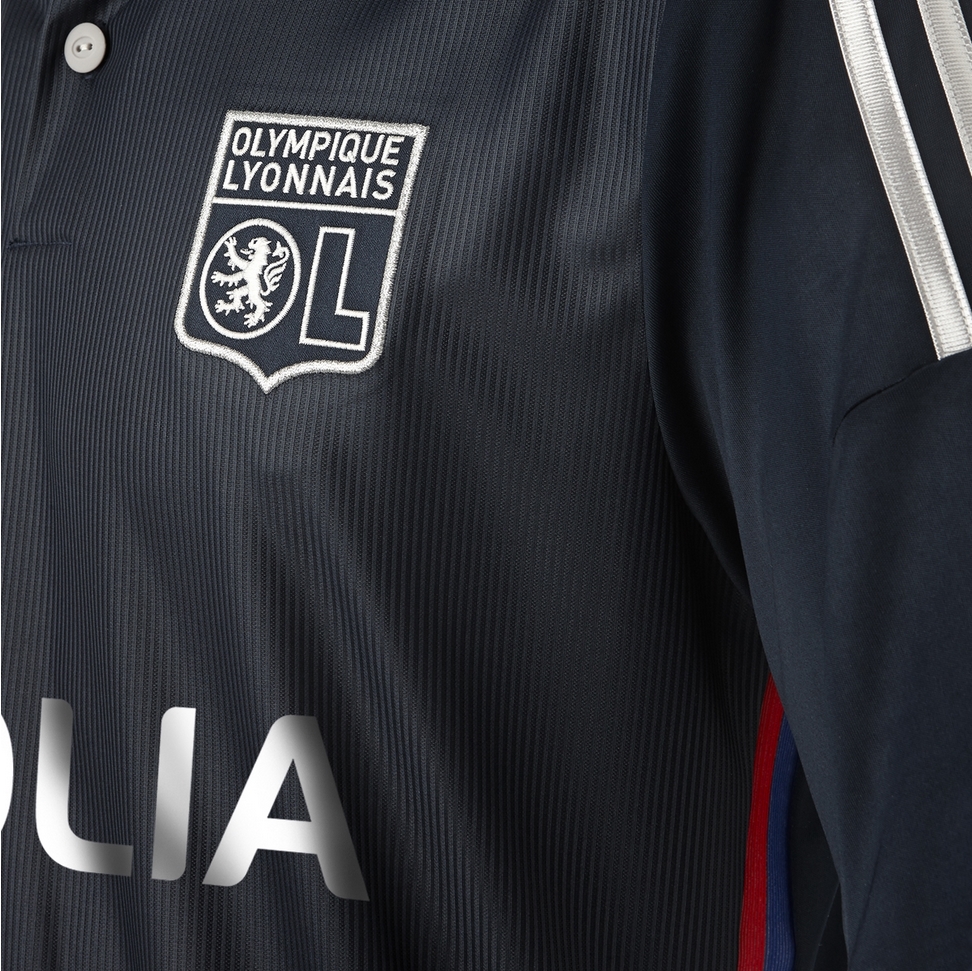 黒のサードは、レアル・マドリーの2014-15モデルでお馴染みの「マオカラー」が特徴。前身頃のシャドーストライプでシックな雰囲気を出しつつ、サイドに配されたツートンカラーのラインがリヨンのイメージを強調する好デザインとなっている。