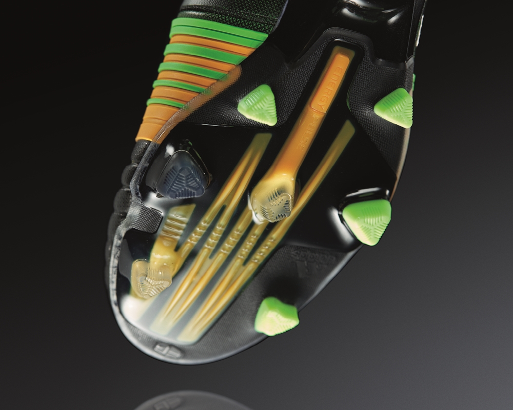 なお、天然芝などファームグラウンド向けのFGモデルでは、強靭なバネ効果で前への推進力やジャンプ力をサポートするエナジーパルスがアウトソールの前足部に搭載されているが(上写真)、日本人の足型を追求したジャパニーズマイクロフィットラスト採用のHGモデルでは今回も搭載されていない。