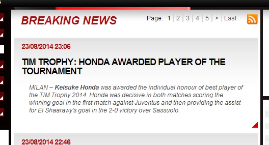 2連勝を果たしたミランが大会を制覇。そして本田はミランの公式サイトの速報によると大会最優秀選手賞を獲得したようだ。