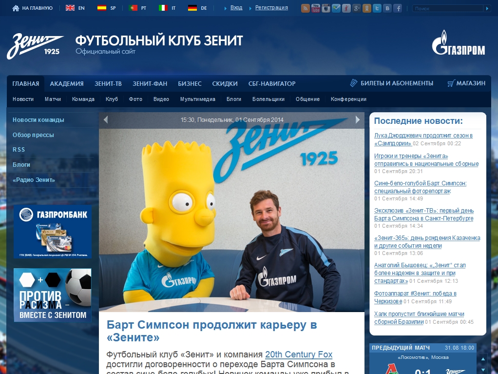 ロシアのゼニト・サンクトペテルブルクは移籍市場最終日となった1日、アメリカの人気アニメ『ザ・シンプソンズ』のキャラクター、「バート・シンプソン」を20世紀フォックスから獲得したことを発表した。
