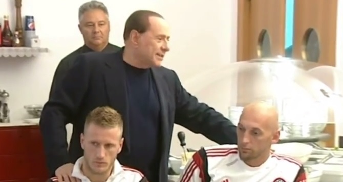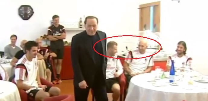 選手1人1人と握手をした後、クリスティアン・アッビアーティとイニャーツィオ・アバーテの肩に手をおいて語り出すベルルスコーニ。(1:29~)