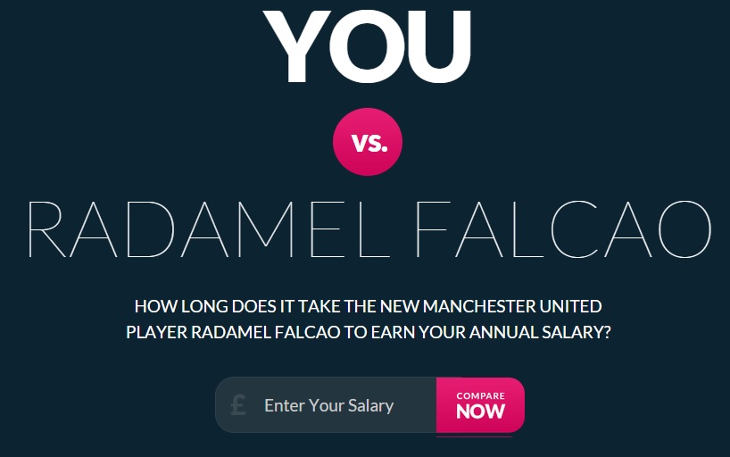 上記画像はキャプチャしたもので、“Enter Your Salary”に自分の年収を打ち込んで“COMPARE NOW”を押すだけ。ファルカオさんがあなたのお給料を稼ぎ出すのにかかる時間を表示してくれます。