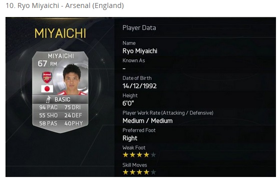 10. 宮市亮(アーセナル→トゥウェンテ/日本/RM/94)