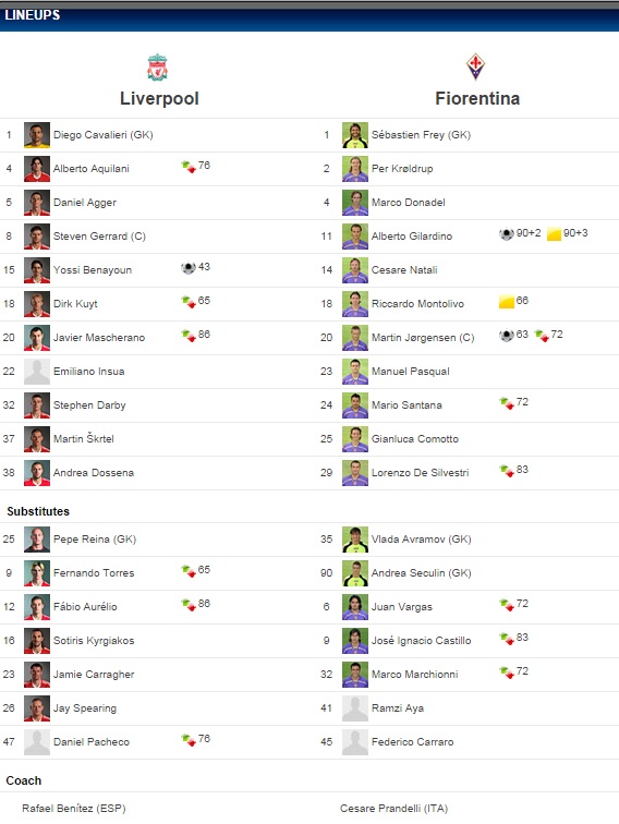 2009-2010シーズンのグループステージ最終節(2009年12月9日)、アンフィールドでのフィオレンティーナ戦の先発メンバーとベンチ入りメンバーがこちら。