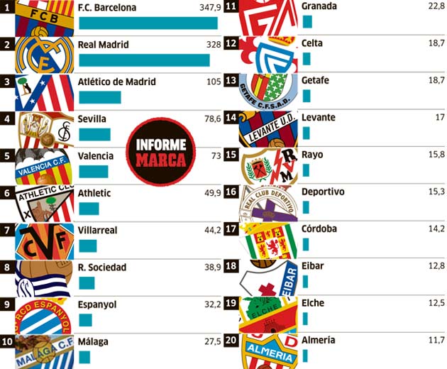 そのなかで、トップはバルセロナの3.479億ユーロ(およそ483億円)、2番目はレアル・マドリーの3.28億ユーロ(およそ456億円)。 これはエイバルやエルチェ、アルメリアといったクラブの約30倍にあたる数字。20クラブの数字は以下の通り。