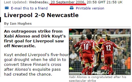 ロングキックの精度はいまだ健在なアロンソの代表的なゴールといえばニューカッスル戦でのあの一撃だろう。いまからちょうど8年前になる2006年の9月20日、当時リヴァプールに所属していたアロンソがアンフィールドで決めたゴールだ。