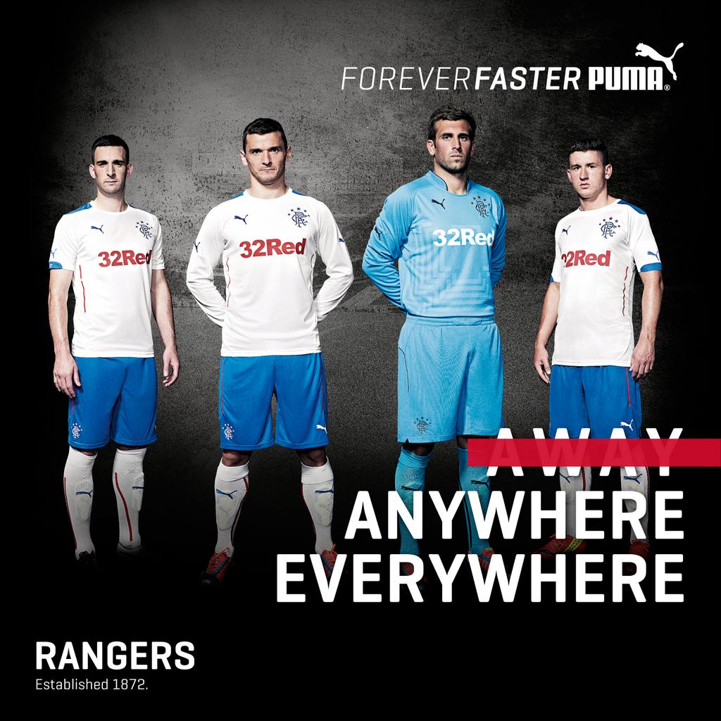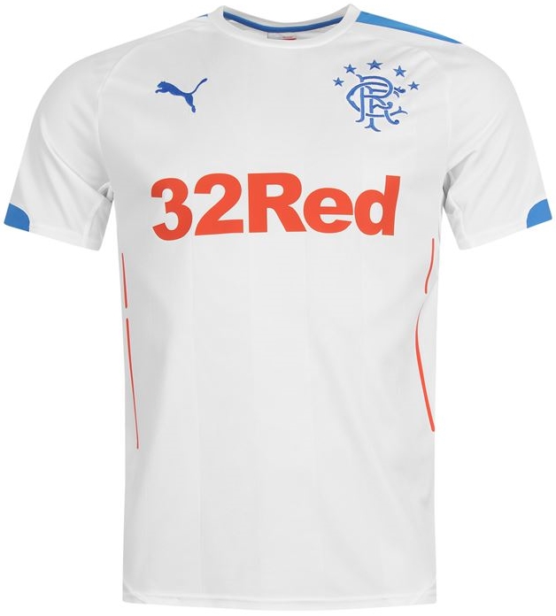 白を基調としたアウェイ。昨季は白に紺の組み合わせだったが、今季は鮮やかな“Rangers Blue”をパンツカラーに採用した。