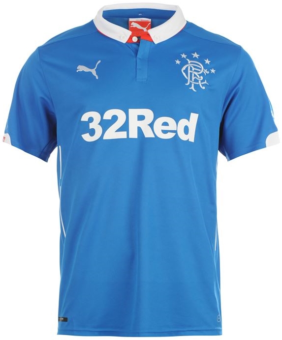 2014-15シーズンに使用する伝統的な青のホームは、ポロネックを採用したクラシカルなデザイン。白の襟にアクセントで入った赤がレンジャーズらしさを感じさせる。