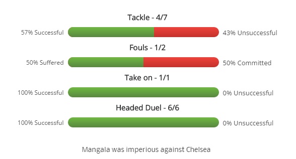 強靭かつ狡猾であるチェルシーFWジエゴ・コスタに対したマンガラについて、『squawka』では同僚DFコンパニとともに印象的なペアを結成したと評価。チェルシー相手にも2人のコンビは大部分においてソリッドで、マンガラはエアバドルで一度も負けなかったと伝えている。また、『BBC』でも「この夏3200万ポンド(およそ57億円)で獲得した選手の並外れたデビュー」として10点満点中8点という高評価を与えていた。