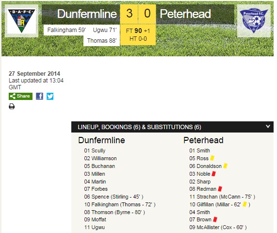『BBC』によれば、この試合でピーターヘッドはレッド3枚、イエロー3枚を貰ったのに対し、ダンファームリンはカード0だった模様。それにしても前半終了時に3人も退場してしまうのはなかなかレアなケースであった。