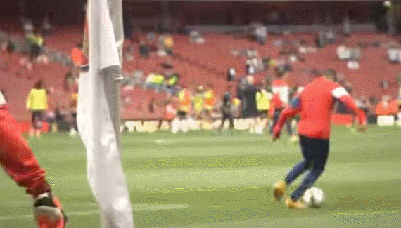 バックステップを踏みながら、ボールを跨ぐフェイント“シザース"を見せたアレクシス。おそらく試合で披露することはなさそうだが・・・まったく器用なものである。
