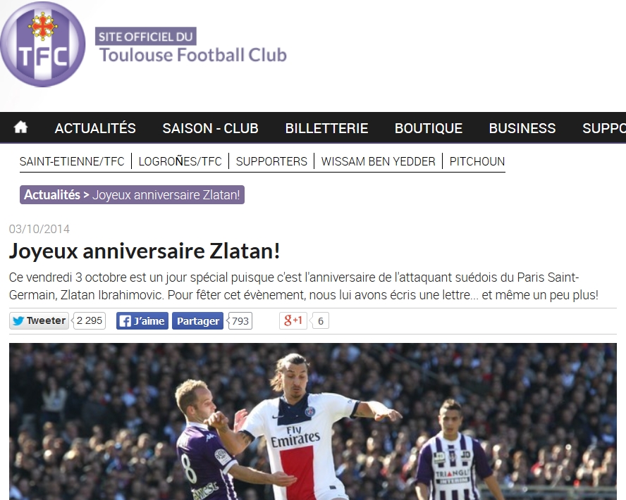 PSGのイブラヒモヴィッチが33歳の誕生日を迎えた10月3日、なんと同じリーグ・アンに所属するトゥールーズが公式サイト上でイブラヒモヴィッチの誕生日を祝うメッセージを公開した。