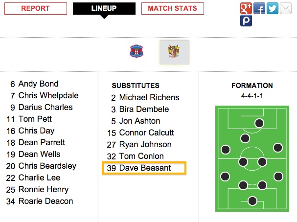 記事によれば、スティーヴェネッジにはクリス・デイという第1GKがいるのだが、この度ビーサントの息子でチームの控えGKでもあるサム・ビーサントが負傷。チームの公式HPにもGK登録はこの2選手のみであり、この危機的状況に際しGKコーチであるデイヴ・ビーサントが選手登録された模様だ。