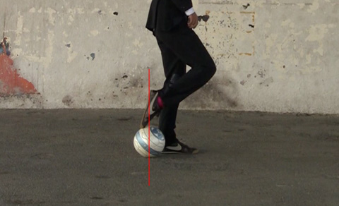 1.の状態のままボールを抑えつつ右足を伸ばすとボールにスピンがかかり、上の画像のように足が伸び切った時に爪先にボールが乗ります。