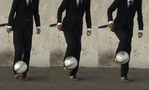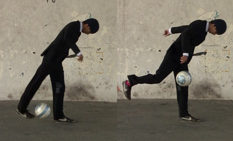 4.でボールが足から離れたらすぐに、膝を振り下ろしボールを地面に叩き付けましょう。