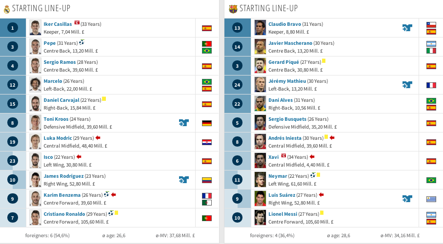 さて、この試合では両チームともベストメンバーに近い選手たちが先発出場を飾り、その豪華過ぎる面々が見せるプレーに世界中が胸を高鳴らせた。ギャレス・ベイルが負傷のため欠場しジョルディ・アルバやイヴァン・ラキティッチがベンチスタートだったものの、まさにオールスターのような顔ぶれが揃った。