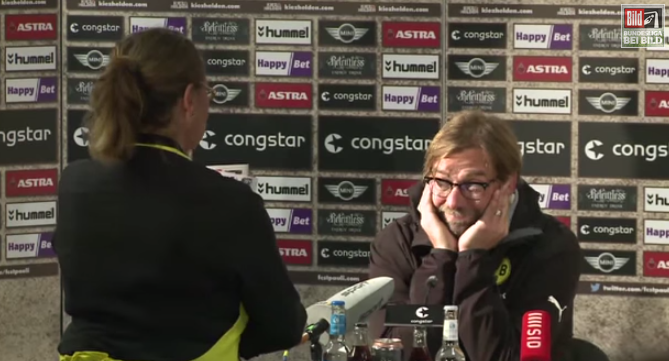 監督会見が始まろうとしていたその時、ドルトムントのエプロンをかけた謎の女性がユルゲン・クロップ監督の目の前に!