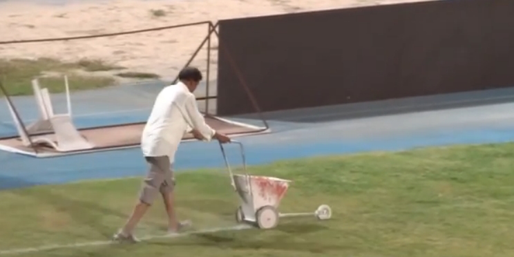 そうした中でテレビカメラがとらえたのは、今更ながらにピッチのラインを引き直すスタッフたち。確かに線は薄いが、それは審判が試合前に確認しておくものなのでは・・・。