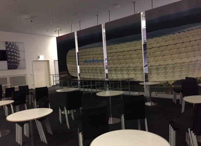 ここの部屋は両チームに加えて代表戦実施時はドイツ代表の会見でも使われます。後方にはスクリーンが用意されており、スポンサーなどのロゴを表示することができるようになっています。通常写真左側にはホームチームの監督、右側にはアウェーチームの監督が座るとのことです。中央の席は必要に応じて選手やフロントの人物が座るために用意されているのだとか。